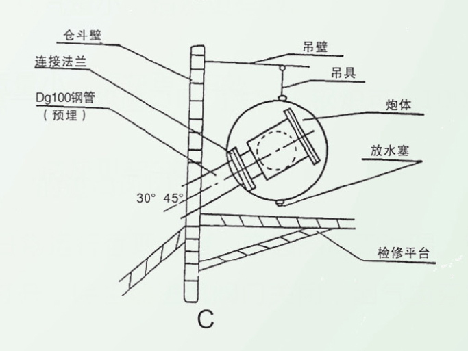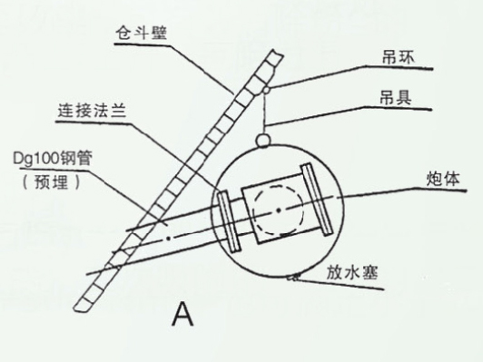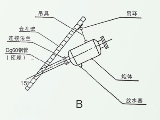 1、安裝時(shí)空氣炮噴射接管(倉內(nèi)部分)應(yīng)向下布置,其角度與水平線不得小于1 5℃。