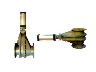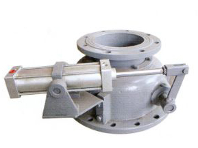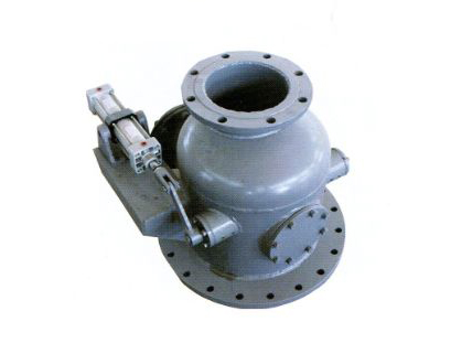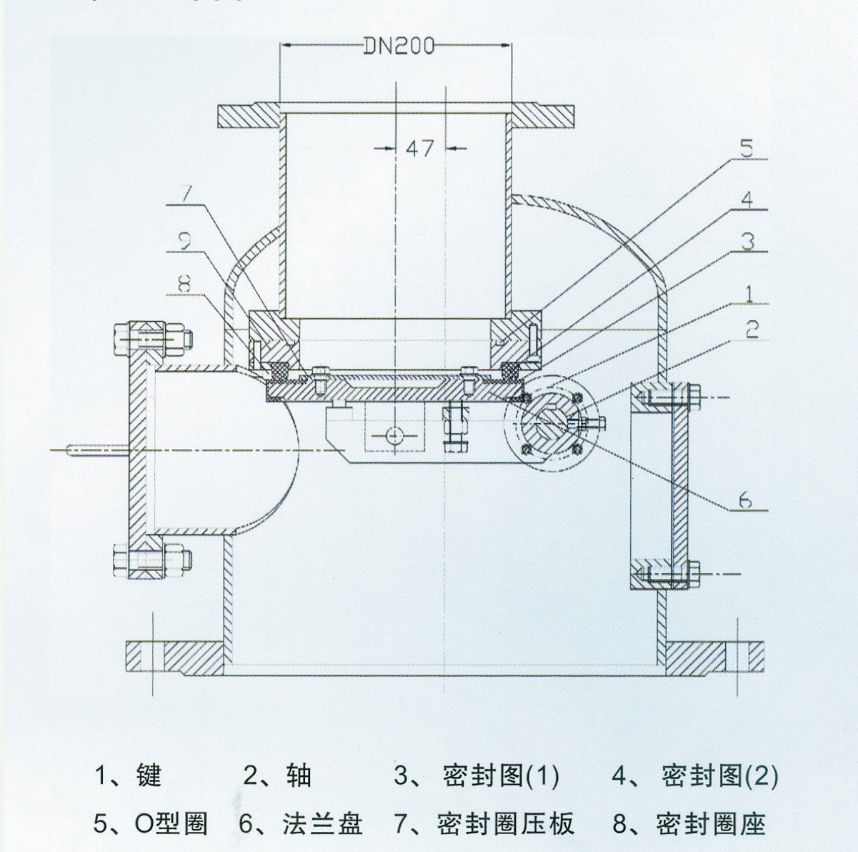 進料閥設(shè)置于發(fā)送器頂部,用于發(fā)送器的進料進行控制。其工作原理是由外部氣缸帶動軸作900回轉(zhuǎn)從而帶動法蘭盤,當法蘭盤向上時,即關(guān)閉進料閥。密封是依靠固定在閥體上密封圈(1)和固定在法蘭盤封圈(2)的緊密接觸為實現(xiàn)的。